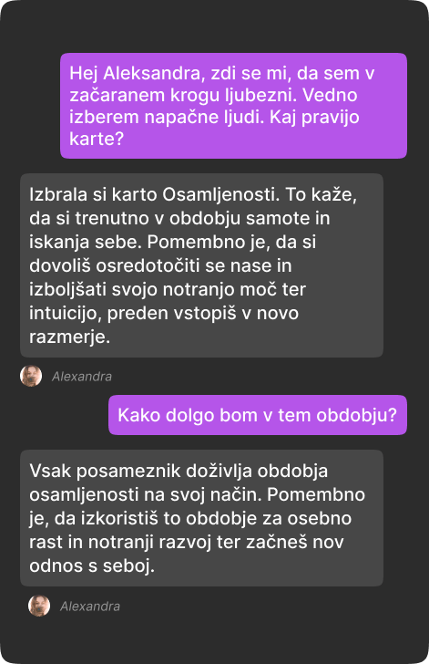 Aleksandra, hvala, ker si mi pomagala odstraniti karmične blokade, ki so me obremenjevale. Po branju sem se počutila, kot da sem znova zaživela – polna energije, zaupanja in jasnosti. Všeč mi je, da ti lahko kadarkoli napišem sporočilo in da imaš tako dosegljive cene.