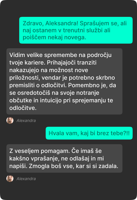 Pokazala mi je, kje sem zataknjena v starih vzorcih, in mi dala konkretne korake, kako jih preseči. Aleksandra mi je odprla oči za priložnosti, ki jih prej nisem videla, in mi pokazala, kako zares aktivirati svojo moč. Danes živim življenje, ki sem ga prej lahko samo sanjala.
